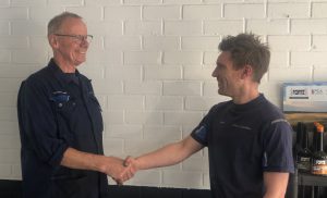 Roy Röring, al jaren in dienst als 1e autotechnicus en diagnosespecialist, neemt het stokje van Harrie over. Roy werkt ook al weer 16 jaar bij ons, begonnen als leerling monteur met Harrie als leermeester!